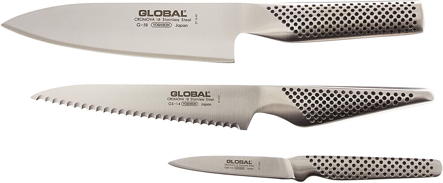 Global 3 Piece Set - 6" Chef's Knife, 6" Serrated Utility Knife, 3" Peeler