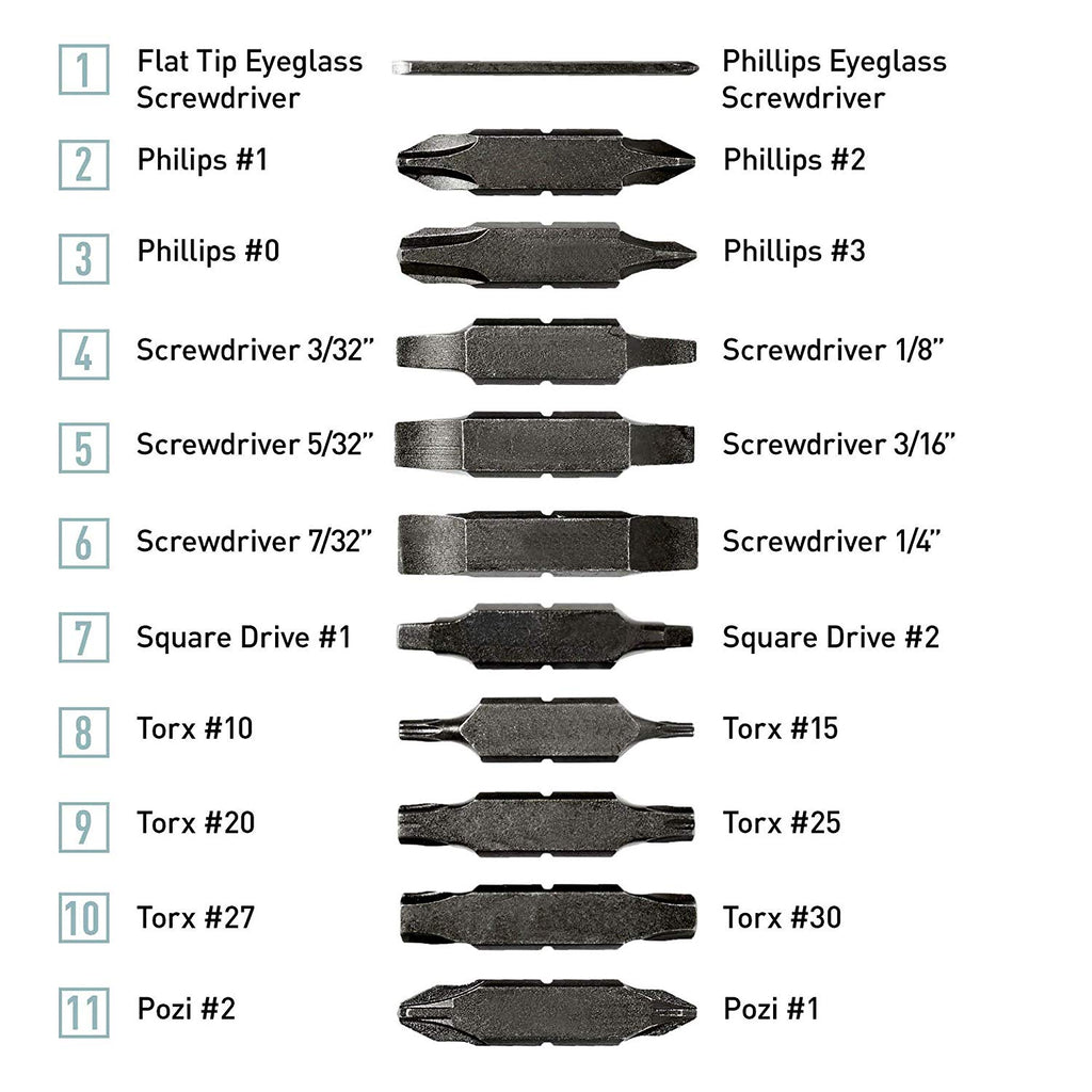 The Bit Kit expands your driver’s capabilities with 21 double-ended bits—42 tools in all. Use the Bit Kit with all tools and knives with bit drivers and Removable Bit Driver.