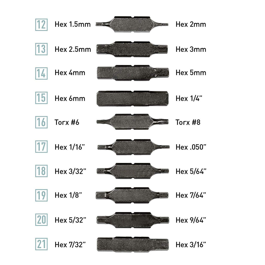 - LET'S BE PRACTICAL: Leatherman's flat bit design means all the performance of a standard hex bit in half the size. With 21 double-headed bits in two small sleeves, you can fit more practicality in your pocket (or sheath).