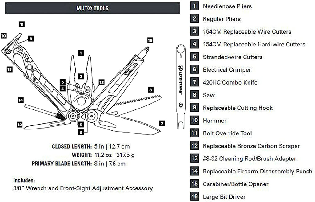 14 TOOLS IN 1: Pliers, wire cutters and crimper, knife, saw, cutting hook, hammer, bolt override tool, bronze carbon scraper, #8-32 cleaning rod/brush adapter, firearm disassembly punch and more